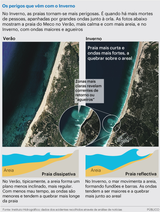 Há praias que têm este perfil de Inverno praticamente ao longo de todo o ano. O Meco é uma delas. A explicação mais plausível é a de que os sete estudantes da universidade Lusófona – dos quais apenas um escapou com vida – foram apanhados por aquilo a que se chama uma onda “colapsante”. São típicas de praias com um fundo muito inclinado, na qual a rebentação ocorre praticamente sobre a orla, com a onda literalmente a tombar sobre a areia, provocando uma grande quantidade de espuma.